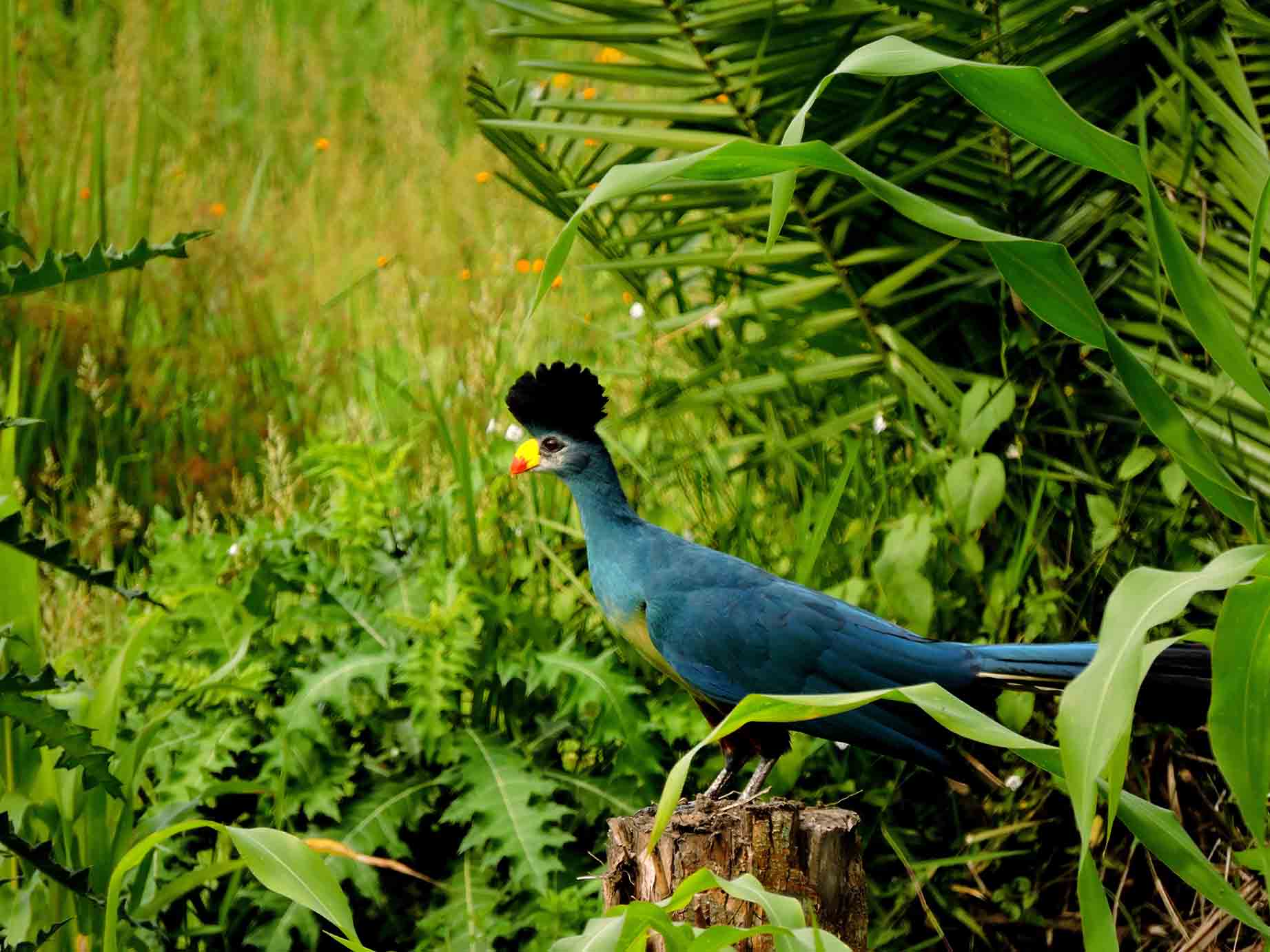 When you’re on a single-minded mission to find mountain gorillas, the forest bird most likely to distract you – however briefly – is this colourful character, whose deep blue plumage, yellow-and-red beak and Mohican-like crest are impossible to miss. Enthusiastic eaters of leaves, flowers and fruit, you’ll often see them high in the trees.