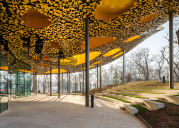 The remarkable structure can be found nestled between the trees in Budapest’s City Park. Its large glass walls are topped with an enormous canopy, studded with holes of varying sizes, allowing light to beam down but also making way for trees to grow up and through.