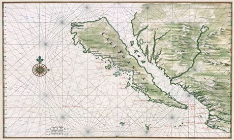 The finger of blame has been pointed at a Carmelite friar who supposedly sailed ‘around’ California in 1602, keeping a diary of his journey. 20 years later he knocked up a map and it was used, unquestioned, for the next 200 years. The image above is of a Dutch map from 1650, though there are said to be 249 maps that show the California peninsula as an island, the last being a Japanese map produced in 1865.