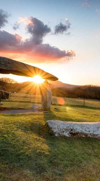 Pentre Ifan is one of the most spectacular Neolithic dolmens (burial chambers) in Europe and dates back to 3,500BC. It consists of a huge tilted capstone perched on three slender upright stones. A blocking stone obstructs the doorway. It’s set in a beautiful location with views to the Preseli Hills and over to Fishguard Bay.