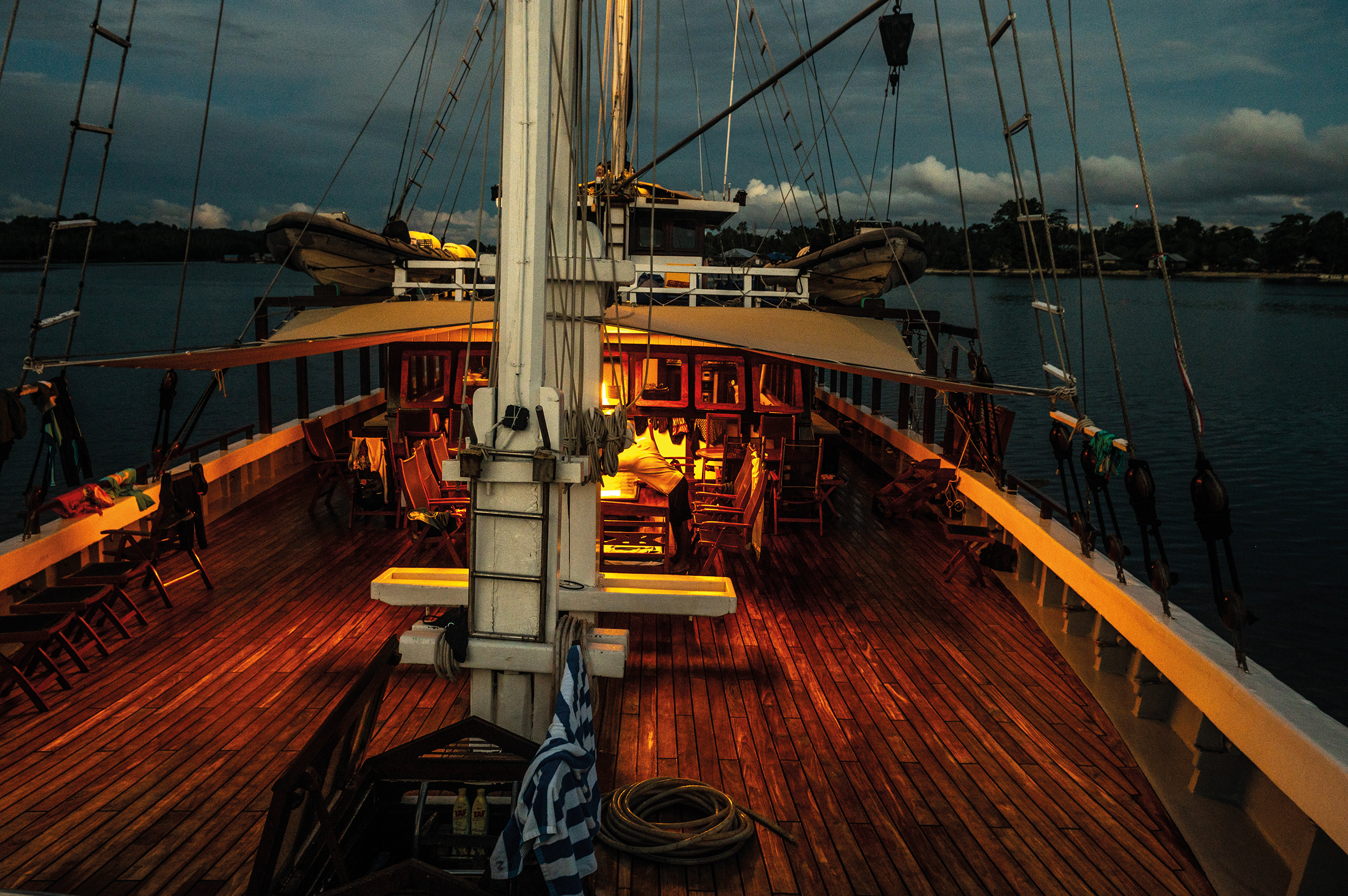 The twelve-cabin vessel Ombak Putih was stylish and robust by comparison. The vessel’s seven sails rose above three decks of polished teak (it was strictly barefoot only) and the crew aboard were all Indonesian. I had a small bunked cabin near the bow that curved like a sultan’s slipper.