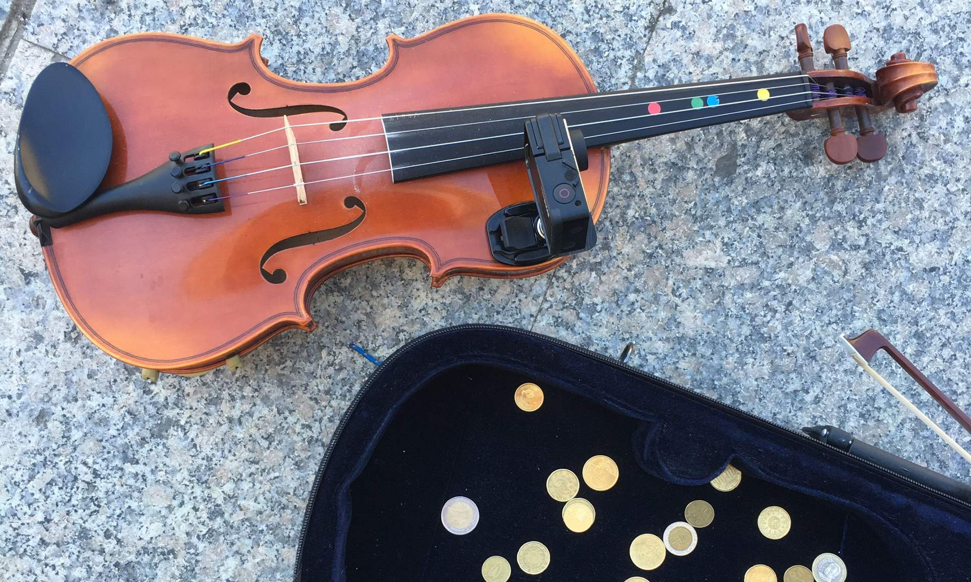 Alastair’s violin and his daily takings (Alastair Humphreys)