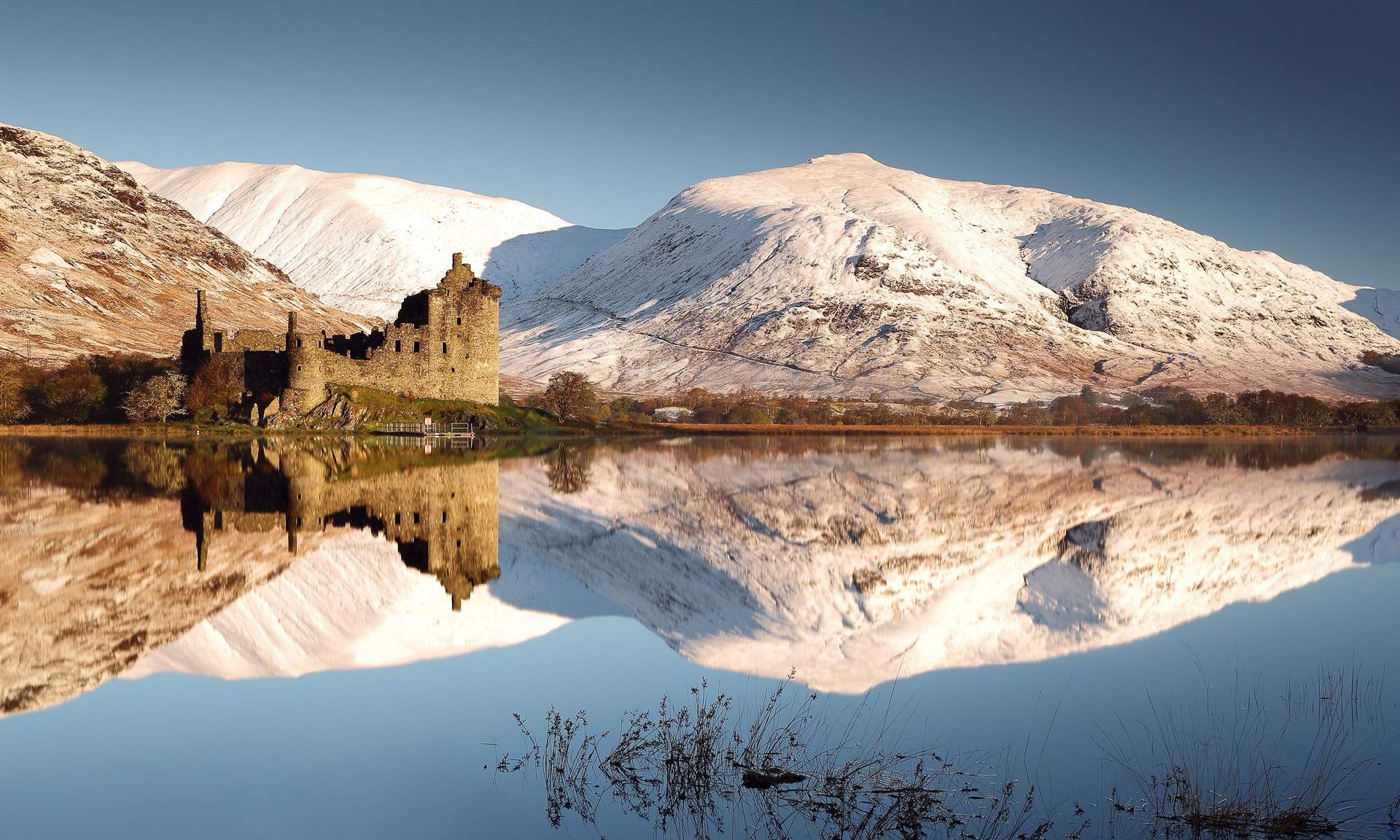Kilchurn Castle and snow covered mountains reflecting off Loch Awe (Shutterstock)