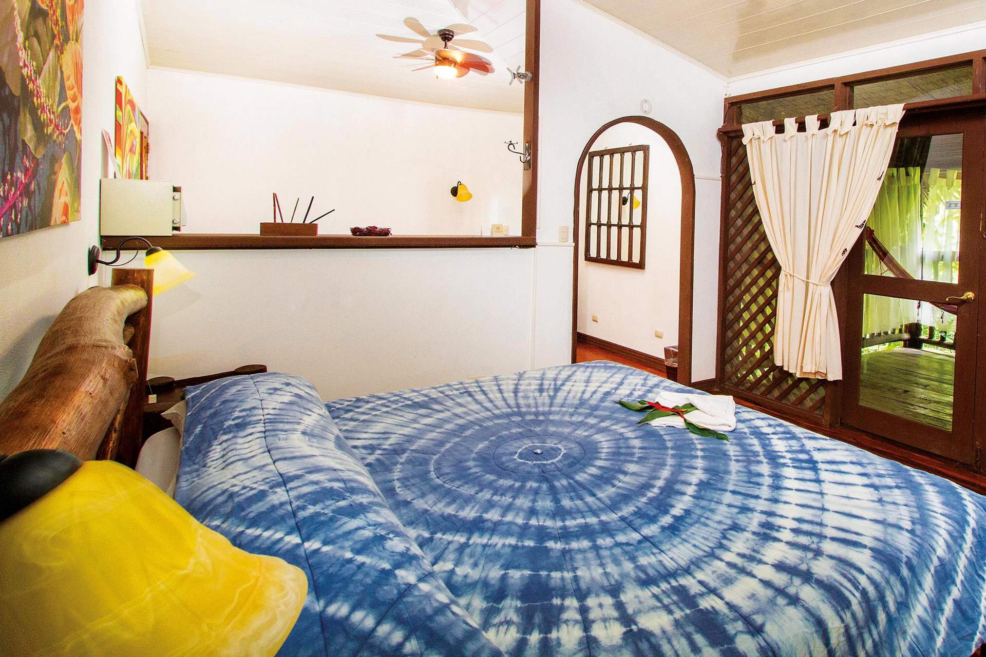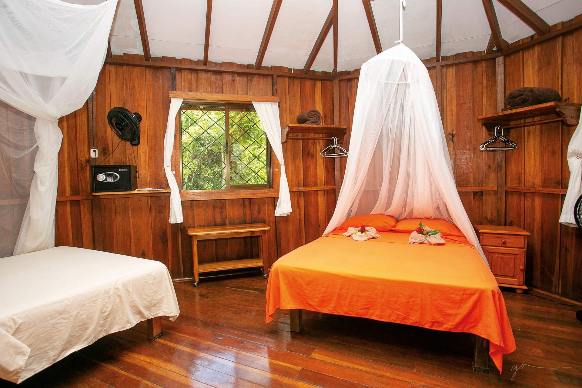Fan-cooled rooms in Ache’s rustic wooden huts are simple, but sloths snooze in the trees, and palm-sized butterflies kiss the creamy orchids in the flower-filled garden.