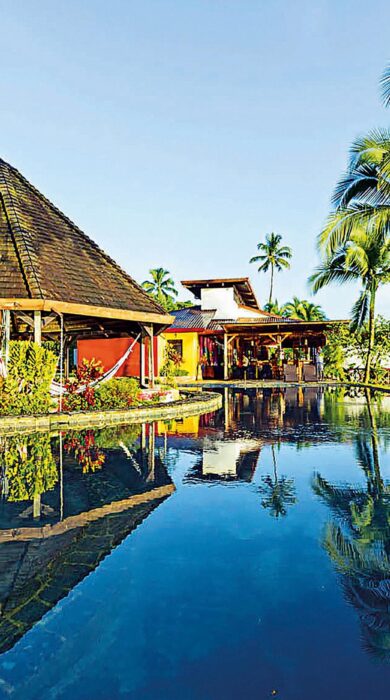 Rooms are gathered in a tranquil tropical garden fragrant with mangoes and brilliant with scarlet heliconia, and it’s easy to do nothing but swim in the deep blue Pacific or watch the horizon meditatively from the shoreside yoga deck.
