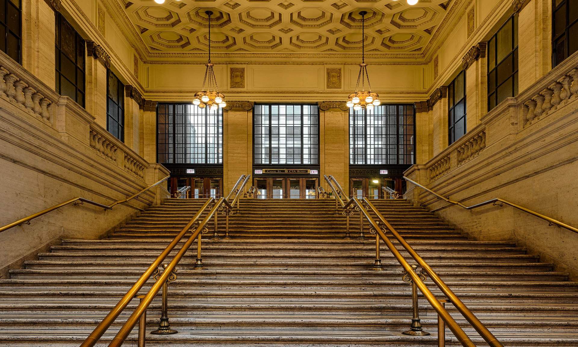 The opulent main concourse stretches the length of two football fields and has a high coffered ceiling painted gold, red and cream, as well as Art Deco chandeliers, ornamented columns, cathedral-like windows and a Tennessee marble floor.