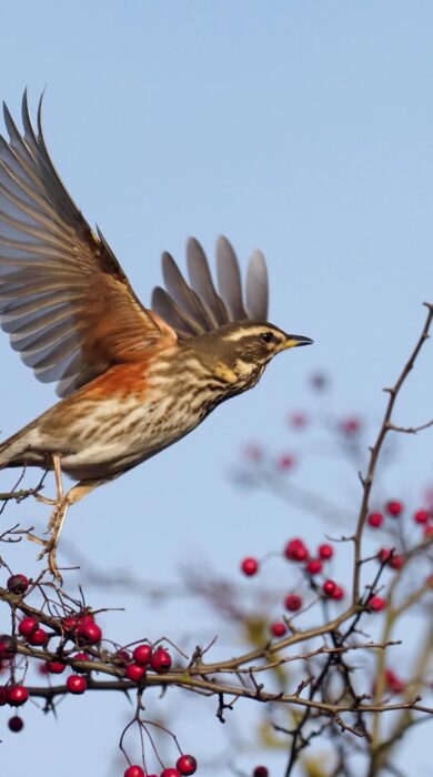 The fieldfare is a handsome northern relative of the mistle thrush. Similarly upright in stance, it is more colourful, with an orange flush to its spotted breast, plus a pale grey head and rump that contrast smartly with its brown back and black tail. This species breeds across Scandinavia, eastern Europe and Russia. It is one of our most abundant winter visitors, arriving from October, with numbers building up through the winter. Flocks disperse across the country, seeking out hedgerows and woodland edges where they can feast on berries – notably hawthorns. In colder weather, especially after snowfall, they may enter parks and gardens, where they are partial to fallen fruit. Come January and February, with the berry crop exhausted, they move into fields, where they hop about in search of worms – often alongside other thrushes. By late March, most have departed. Fieldfares are noisy birds: listen for their tell-tale ‘chuck chuck’ chattering calls overhead.
