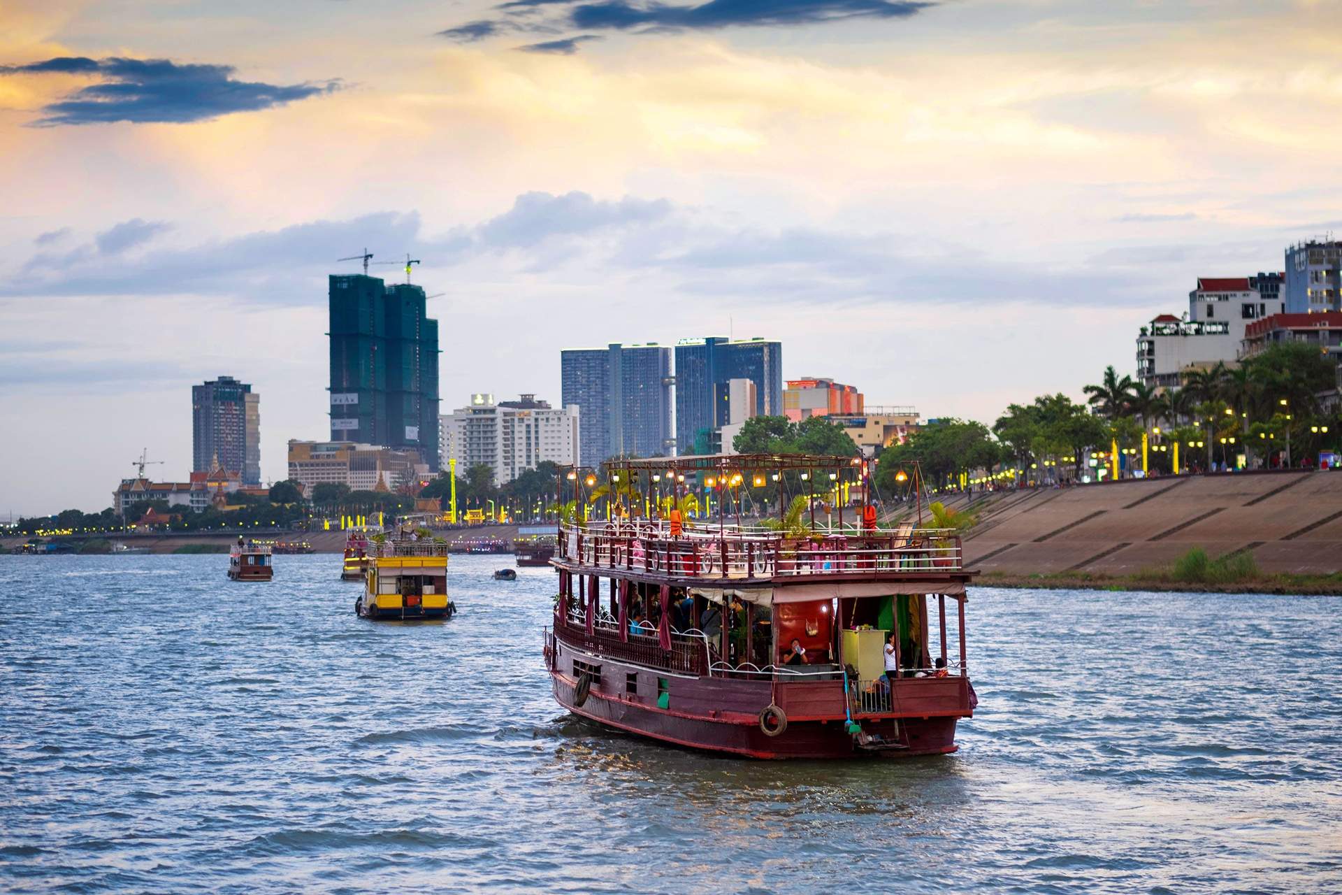 We began with a sedate boat ride to the meeting of the Tonle Sap and Mekong rivers, to watch the sun sink behind the pagodas of the Royal Palace and the neon sparkle-on around the glittering new Chinese-funded glass towers.
