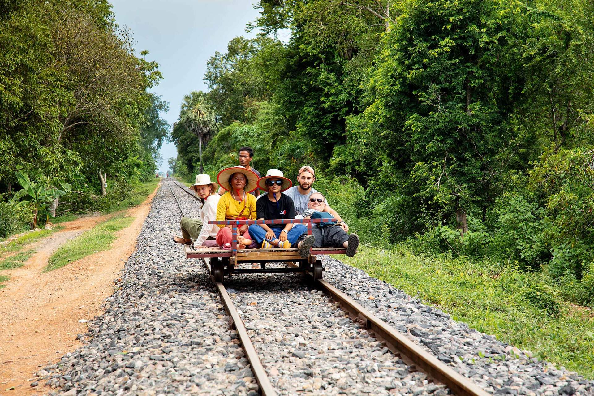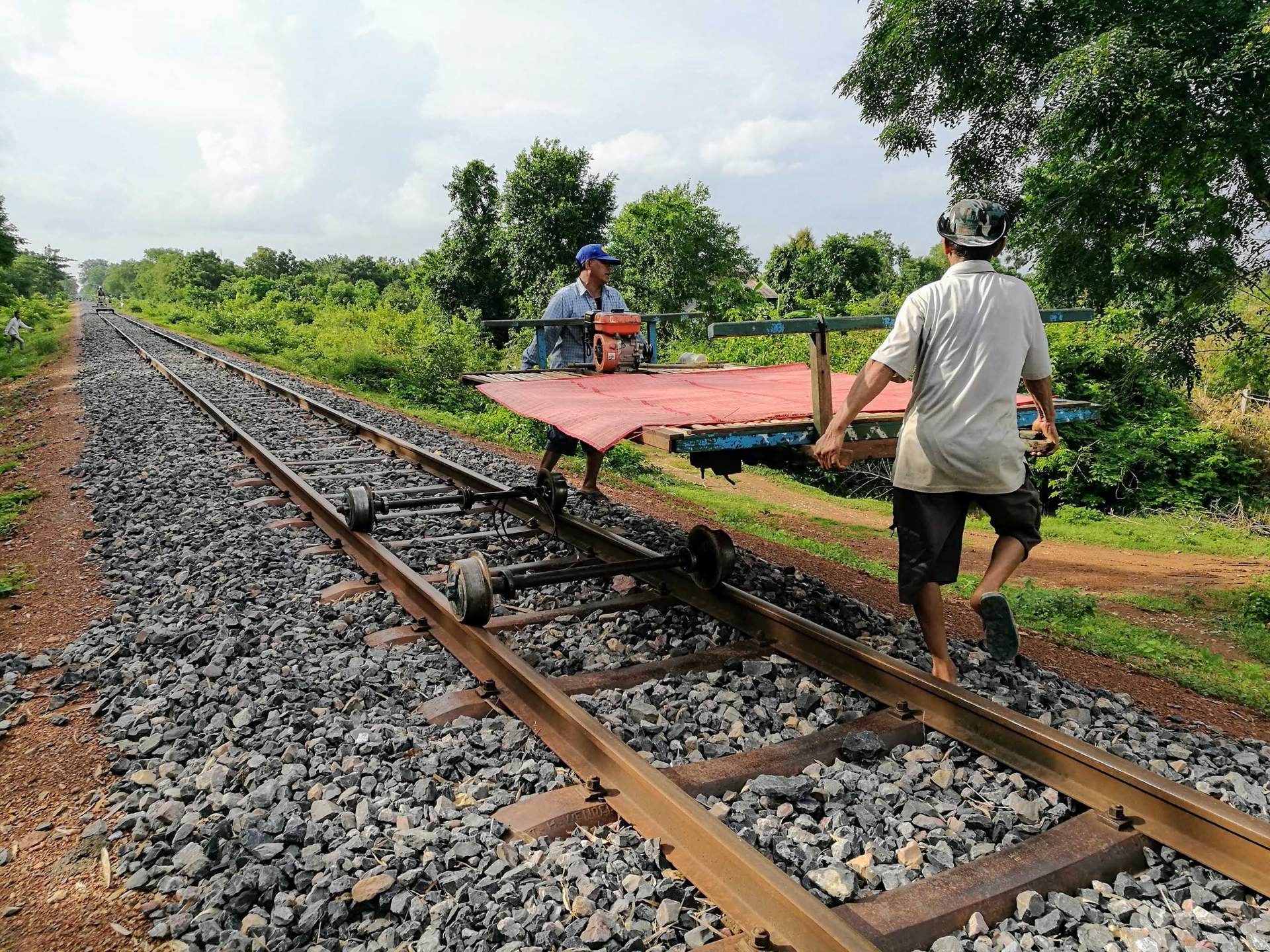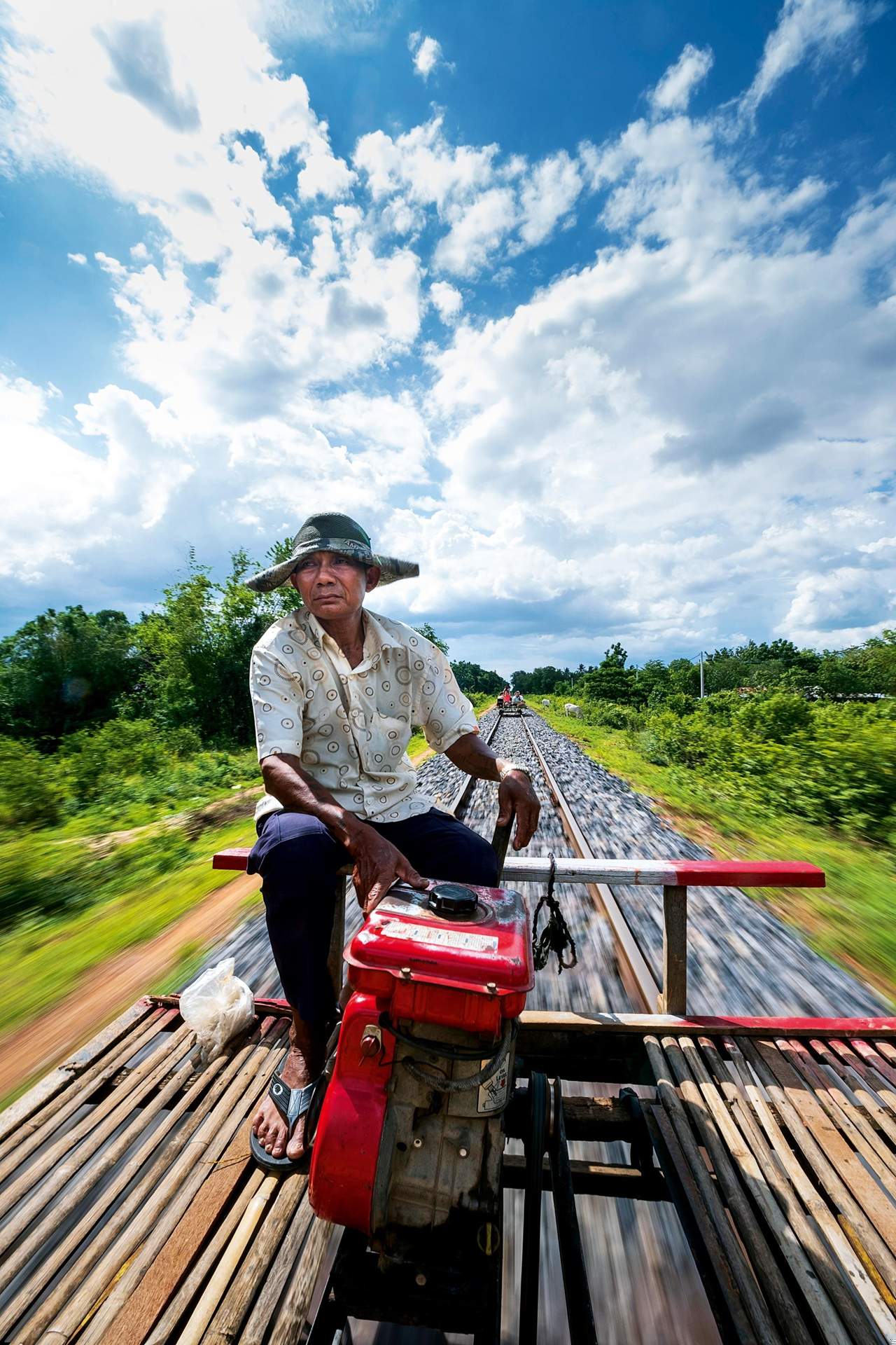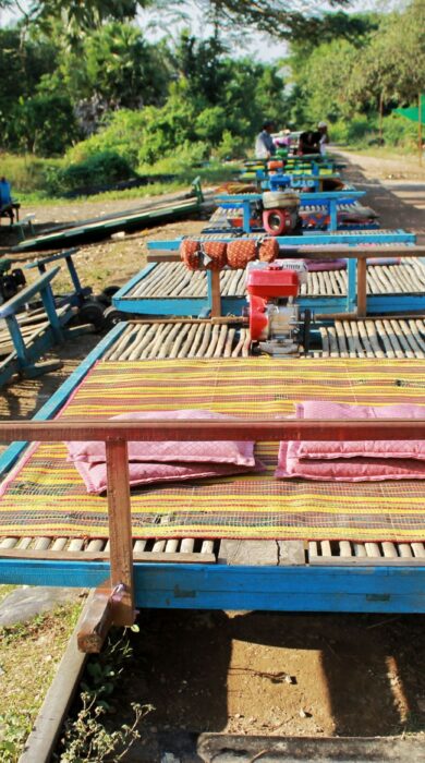 The Khmer Rouge had destroyed the old steam locomotives and railway line, so the localsrepaired the tracks and built their own trains – simple pallets set on wheels salvaged from damaged tanks and either punted along with poles or powered by water-pump engines. The bamboo trains stopped running in 2017 when work on repairing the railway began. Now they run again.