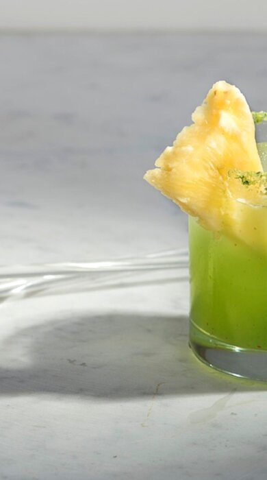 In a shaker, first add pineapple chunk and herbs to blend together, hand-mashing it up. Then add all other ingredients and shake well. Add ice and repeat until mixed. Strain and serve in a chilled-coupe glass. Cover the rim of the glass with cilantro salt and garnish with pineapple slice. The cocktail should be a green colour from blending the herbs with the pineapple.