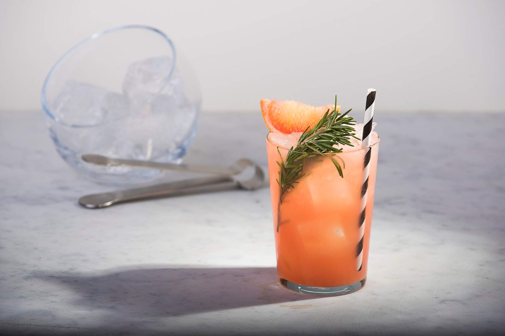 Then, add all the ingredients together in a shaker. Add ice. Shake until mixed. Strain and pour in a tall glass topped with crushed ice. Decorate with rosemary branch and grapefruit slice.