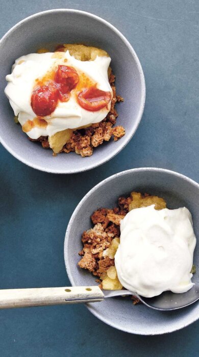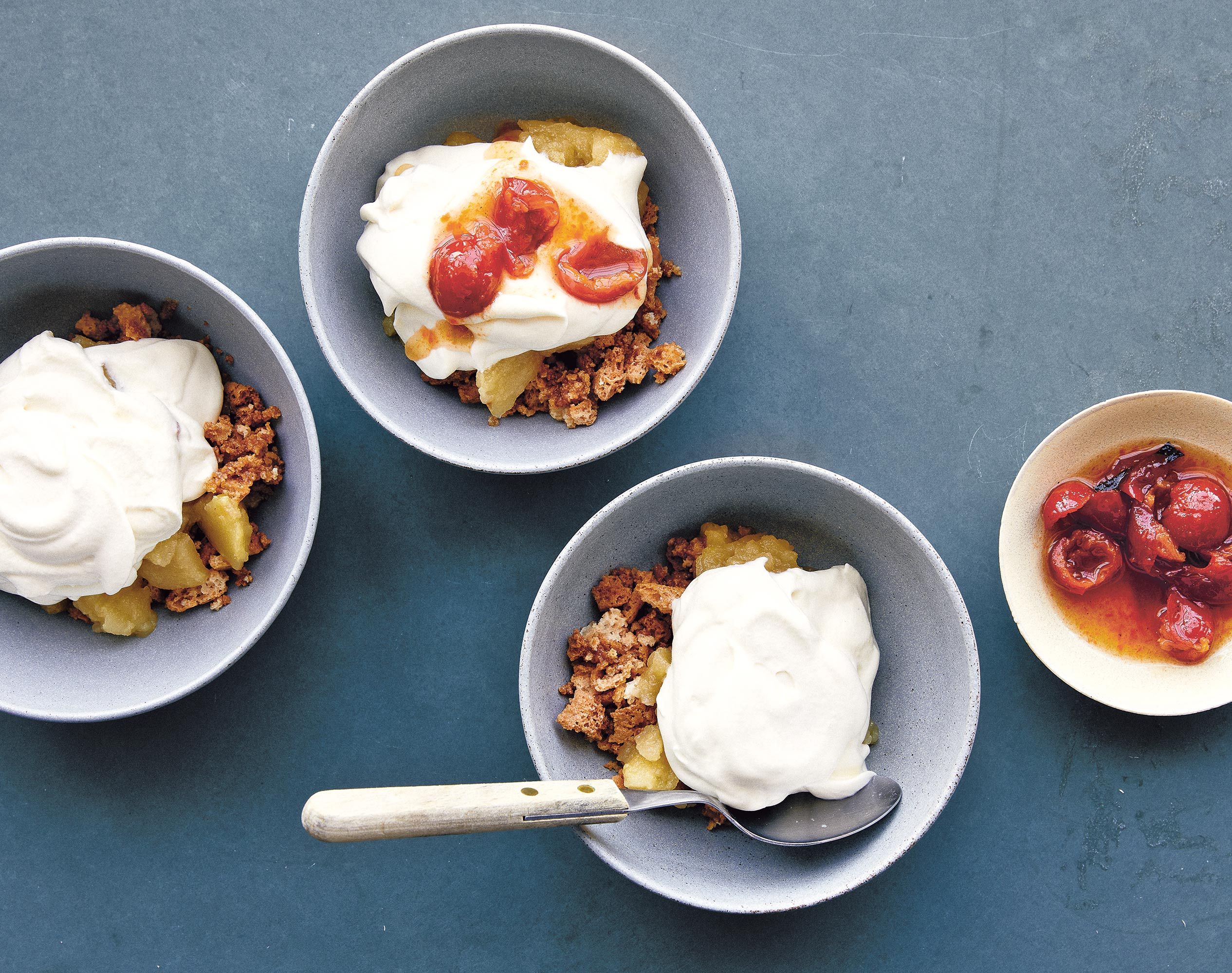 Divide the apple sauce among six bowls, crumble up two macaroons per bowl, then top with two heaped tbsp of the cream mix. Serve with Rosehip Preserve.