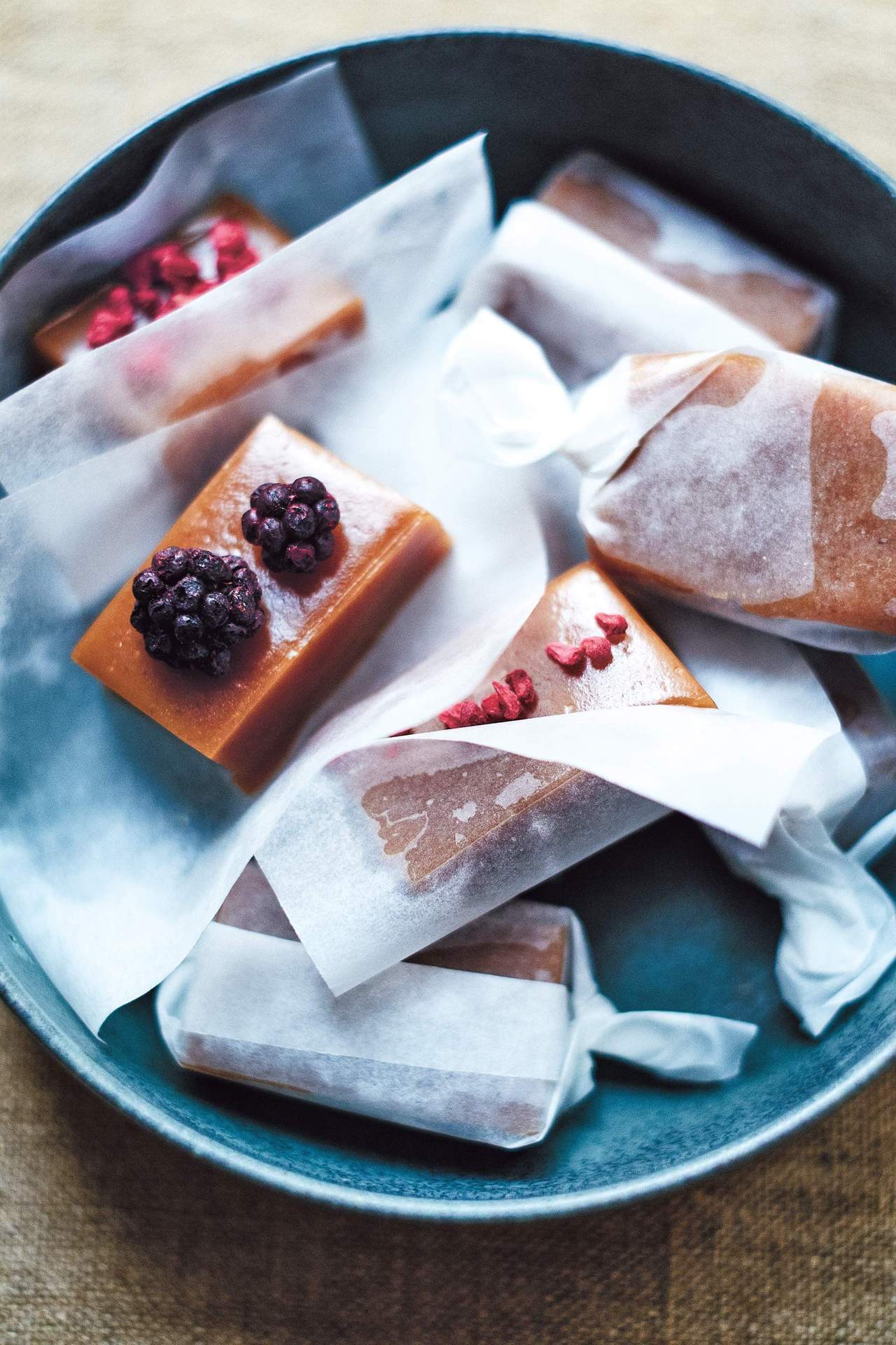 Remove from the tin, then the foil and cut the caramels into small rectangles. Wrap in baking paper. Store in the fridge.