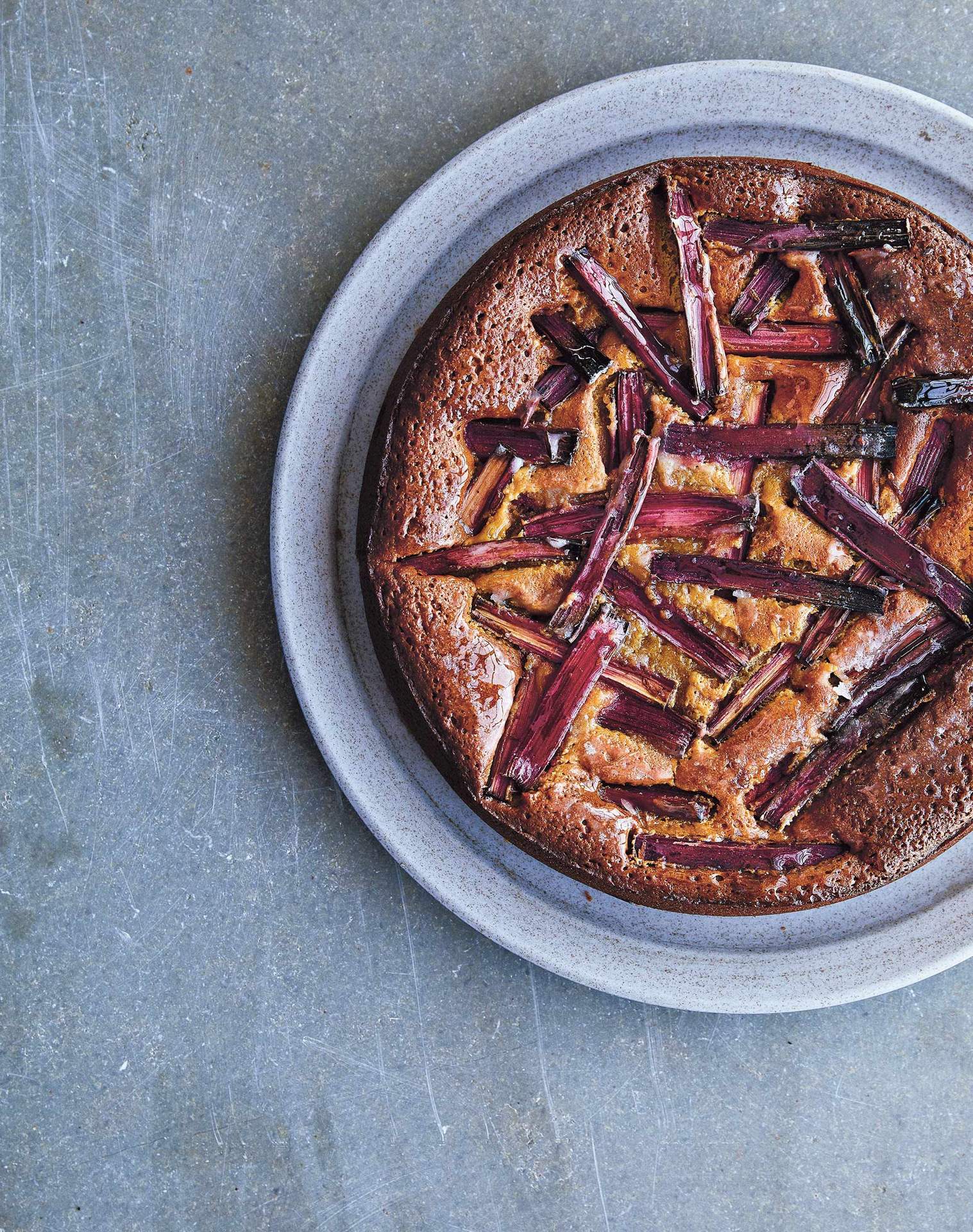 Spread the batter into an oiled 20cm cake tin lined with baking paper and top with rhubarb.