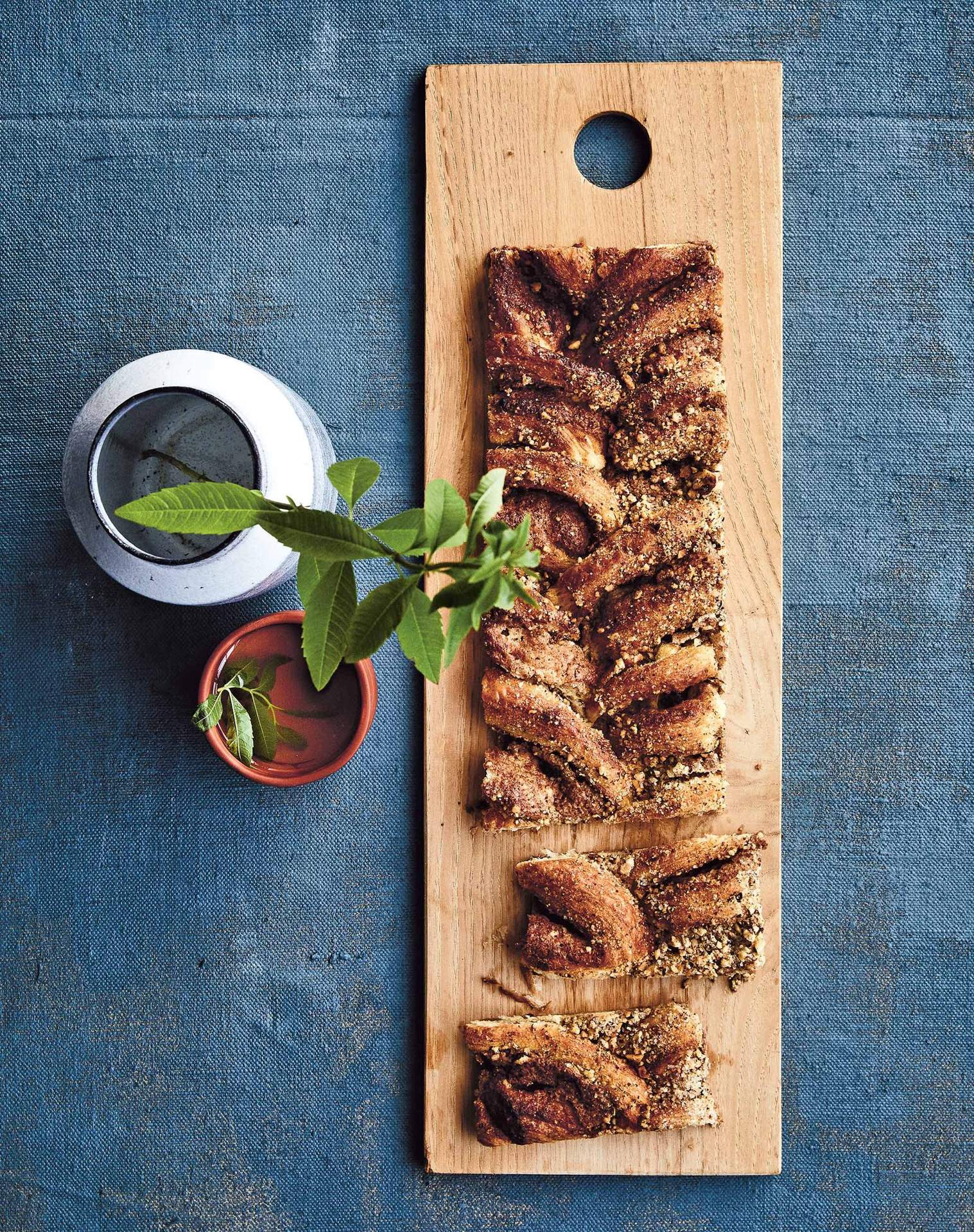 Cut the pastry either side of the filling into two-and-a-half cm-wide strips, leaving them attached at the centre, close to the filling. Brush the pastry with water, then plait the dough so that the filling is covered. Rest in a warm place for 30 minutes.