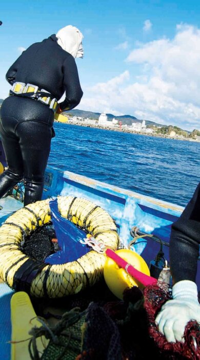 Resembling a sleek seal in her wetsuit, Sayuri emerged alongside her husband’s boat and swung a net filled with sea cucumbers on deck. With lithe agility she climbed on board and began examining her seafloor harvest.