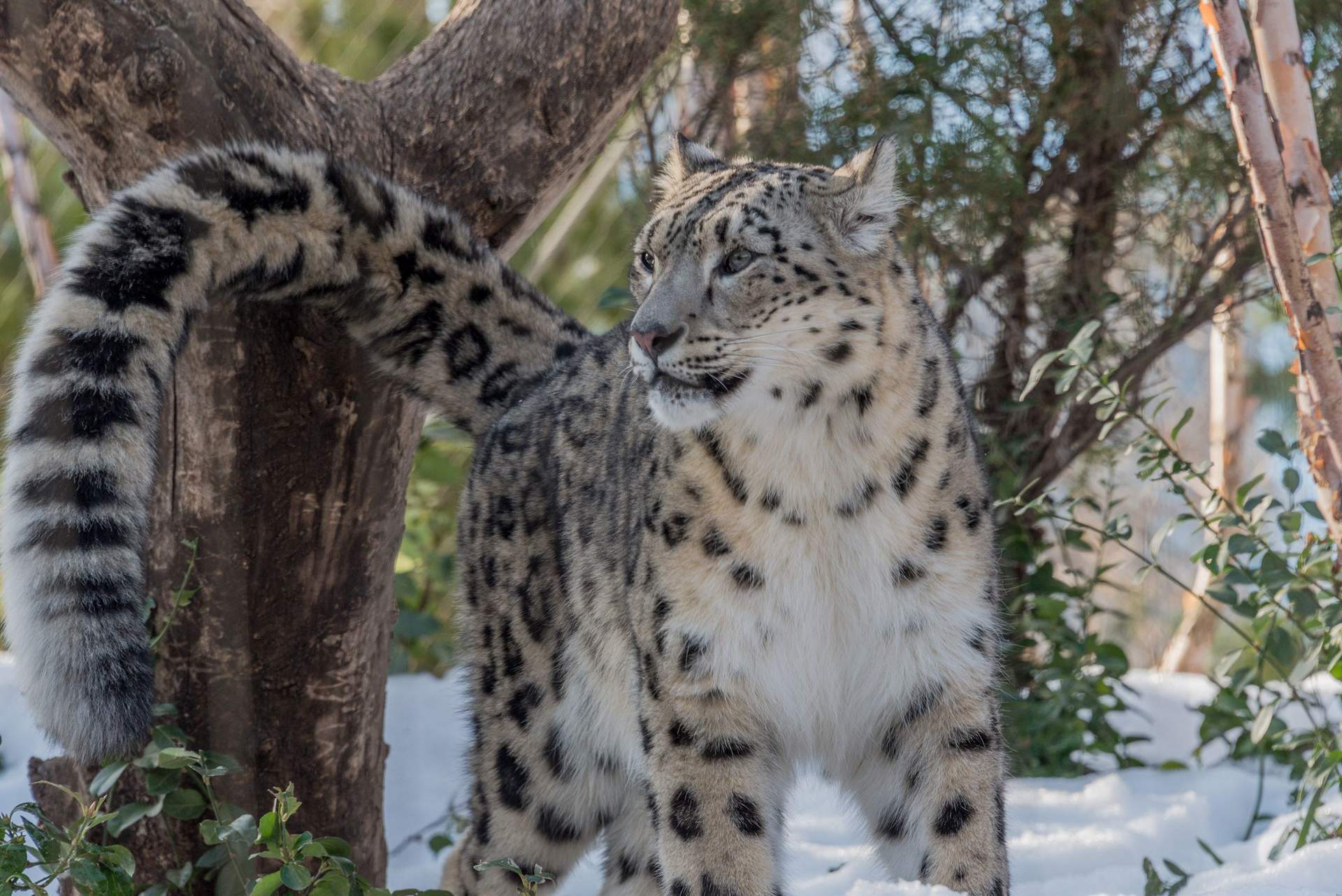 Their long tails are thick with stored fat and covered with dense fur. This assists with balance on steep and rocky terrain, and allows them to be used as scarfs. The leopards use their tails to keep their faces warm while they sleep.
