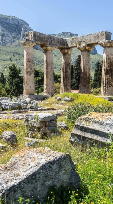 The Peloponnese has various ‘minor’ but fascinating ancient sites. Almost within sight of the touristic hub-bub at Mycenae, ancient Nemea offers a stadium with the oldest known entrance tunnel, a good museum, well-preserved baths and (best of all) the 4th-century BC temple of Nemean Zeus, partly re-erected under the supervision of American archaeologist Stephen Miller such that nine Doric columns and two architraves rear up, whereas formerly there were only three columns. According to Greek mythology Nemea was home to the Nemean lion killed by Hercules in one of his twelve labours, and later also the site of the ancient Nemean Games.