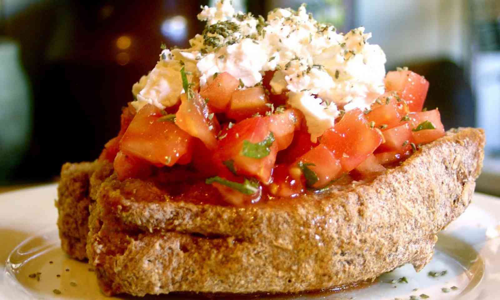 Moisten large barley rusks with a drizzle of water and olive oil, and top with generous mounds of grated uncooked tomatoes (you may wish to strain out the juices beforehand). Cover with a big handful of crumbled feta cheese, a few capers and a sprinkle of oregano – and devour immediately. Use top-quality ingredients for the best results: vine-ripened tomatoes, extra virgin olive oil, and traditional Greek feta cheese.