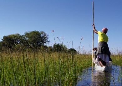 Ten thousand years ago this whole area was a vast lake, but now the waters peter out in the Kalahari desert further south. The Okavango is perhaps Africa’s last unspoilt wilderness. Botswana’s safari industry is well developed, but the number of lodges in the Okavango has been carefully controlled.