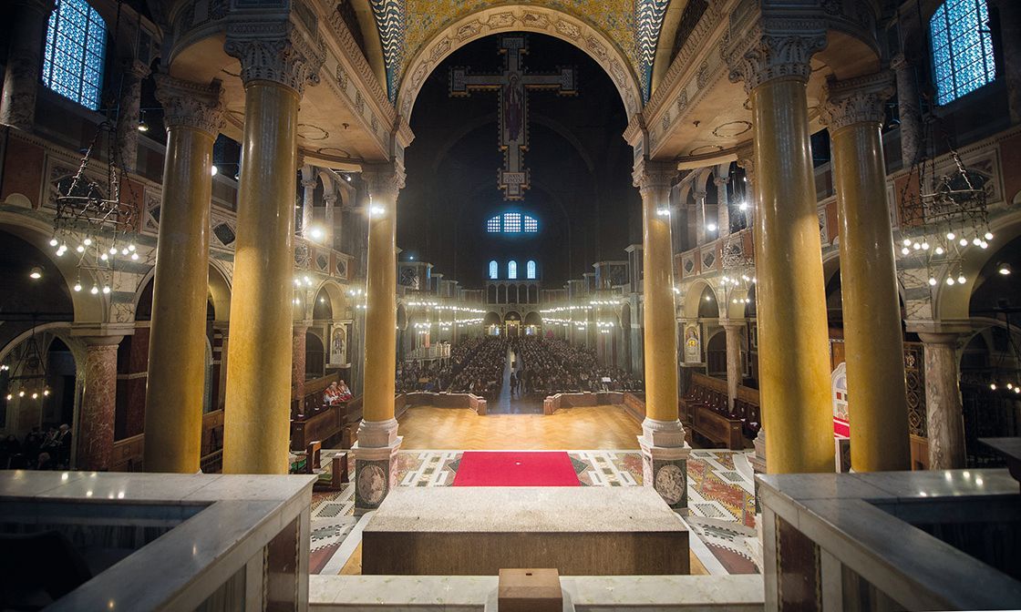 The Roman Catholic cathedral of Westminster, built at the turn of the 20th century, resembles a giant, red-and-white striped railway station or fantastic Byzantine warehouse. Its two-tone interior is stunning to the senses – elaborate and flashy, with gold and marble bling below the balcony, and above that a vault of dark sooty black, mysterious and profound.