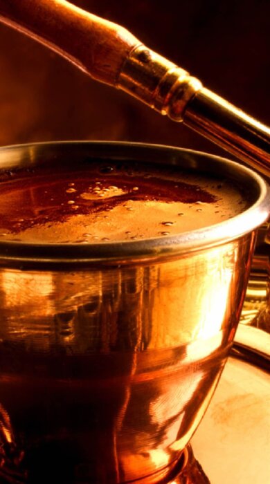 A copper cezve yields the best results. There are different sizes of cezve available, manufactured according to the number of finjan of coffee you plan to make. For the best results, choose the correct size.