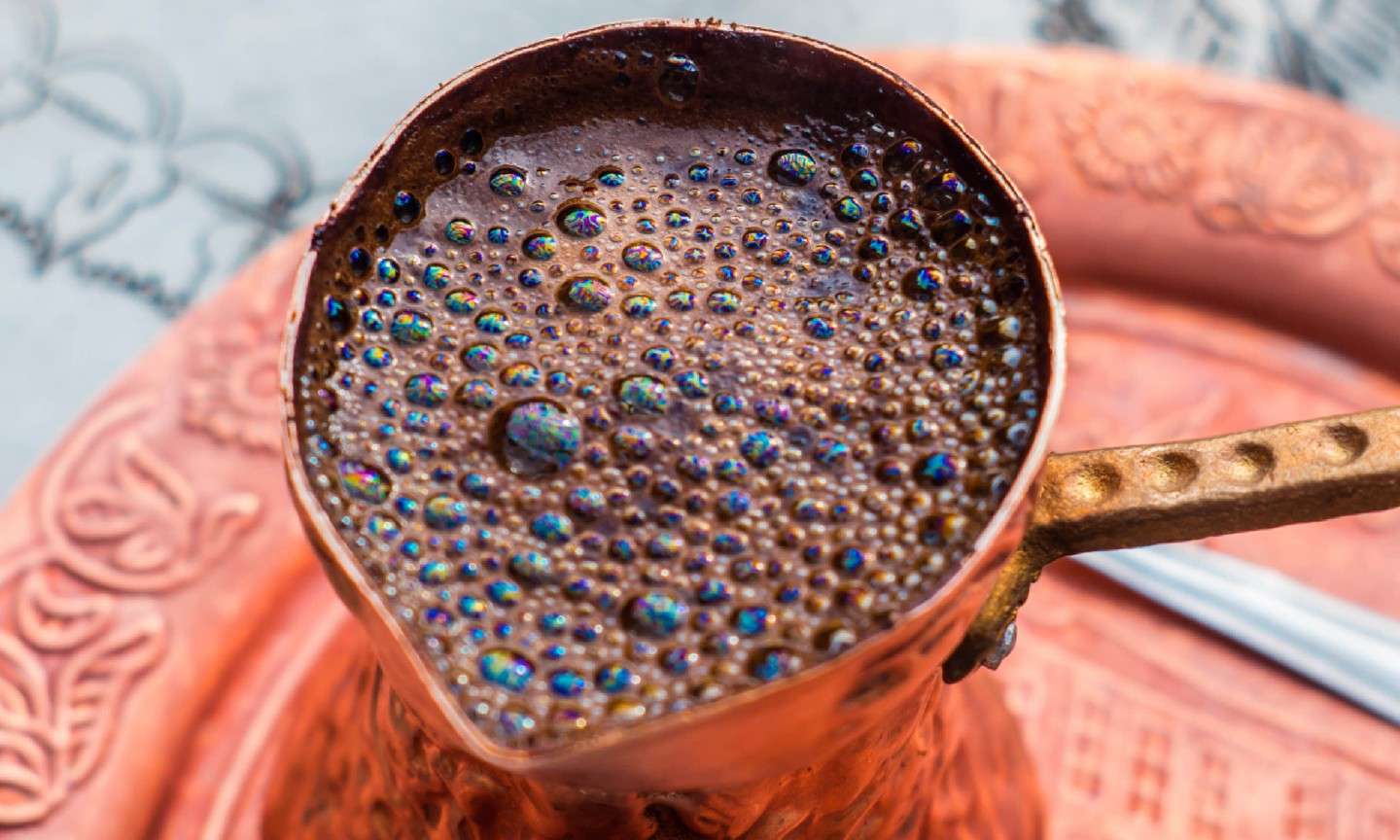 When making Turkish coffee, the cold water is measured, the sugar (if any) and the coffee are added, the two (or three) ingredients are mixed well and then heated, and the cooking is finished as you stand over the pot. When the coffee foams, and looks like it’s about to run over, it must be pulled away from the heat source immediately.