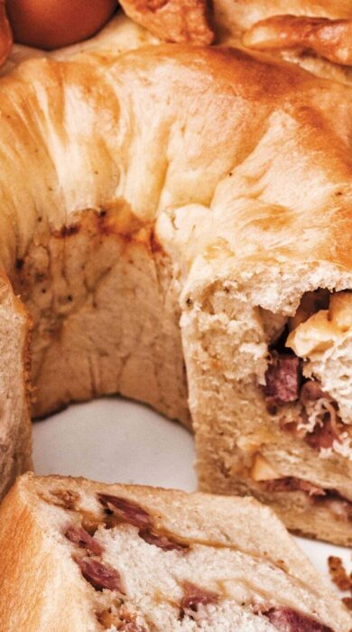South Italy’s tables are renowned for their decadent holiday meals, but nothing quite rivals the multi-day feast of Easter. Especially after the ascetic Lenten period, devout Catholics are eager to break their fast and commemorate the resurrection with symbolic foods. For South-dwellers and especially Neapolitans, Casatiello is the iconic savoury bread for this holiday time. The best versions feature lard from recently slaughtered pigs and inlaid eggs symbolizing the Resurrection.