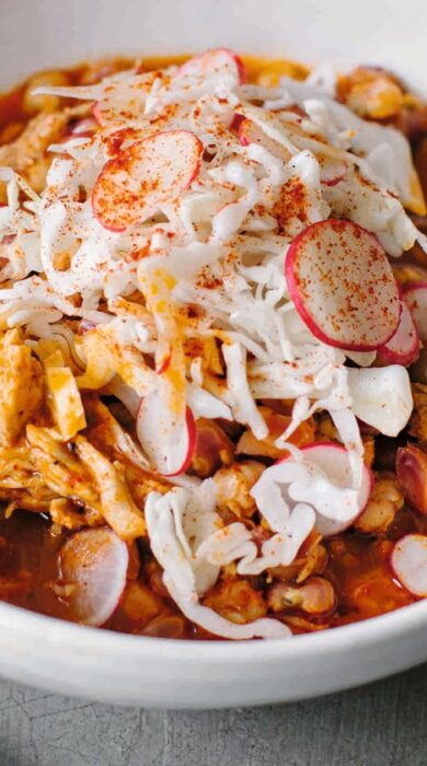 To serve: Place the pot of pozole and all the garnishes, in separate bowls, on the table. Let every person add their own garnishes.