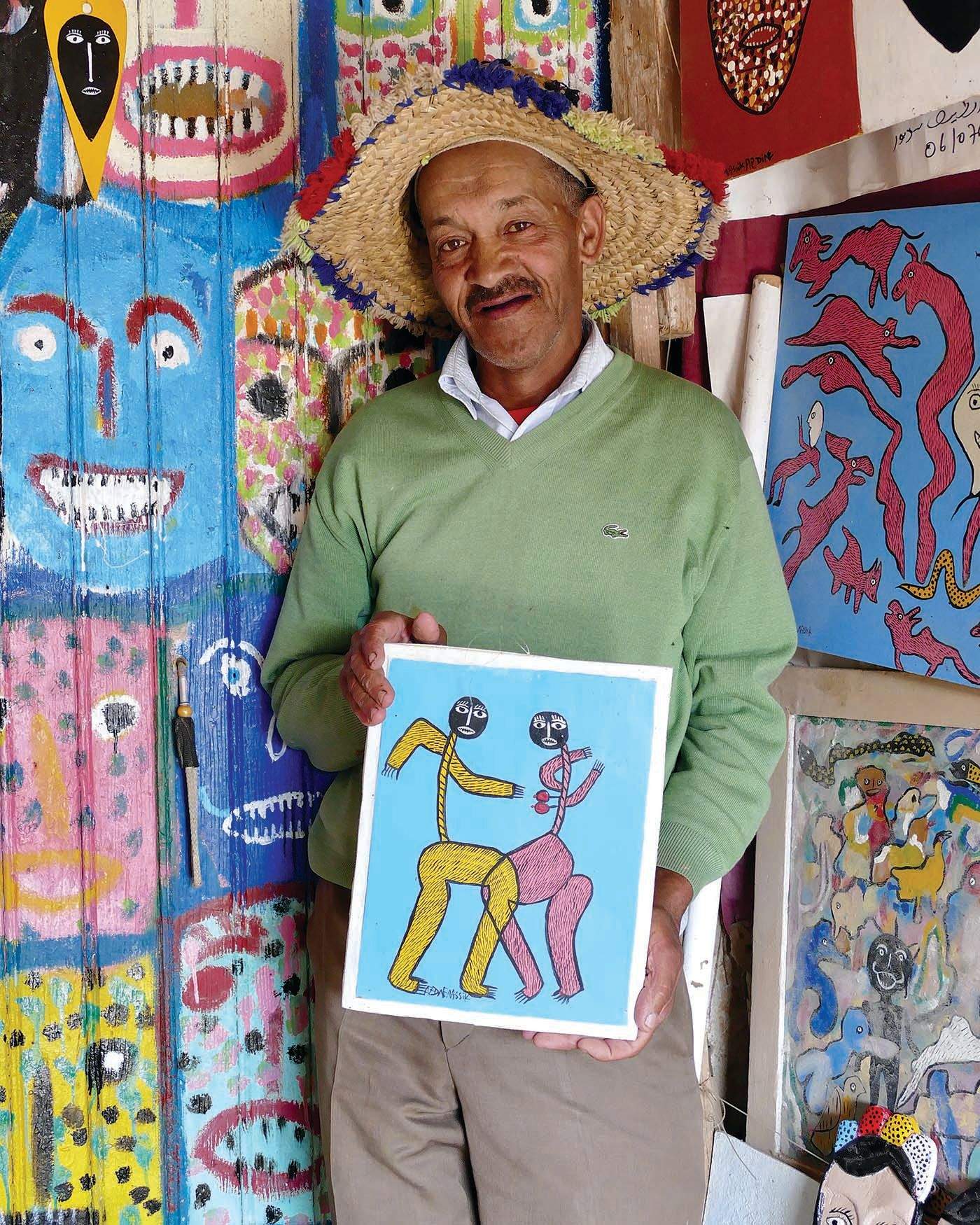 Among the trash and treasure of the Souk Joutiya, or flea market, in the former industrial quarter, I found artists’ ateliers surrounded by broken TVs, discarded oars and scrap metal. Inside these fishermen’s huts turned makeshift studios, I discovered a world of vivid colour and curious forms, improvised sculptures and imaginary creatures, painted on canvas, wood, even animal skin. One artist, Abdelaziz Baki, takes inspiration from nature, upcycling objects and turning them in to brightly coloured sculptures of fantastical creatures; Azeddine Nasik creates simple scenes on offcuts of wood; meanwhile Mustapha Filali paints depictions of rural life, filled with humour.