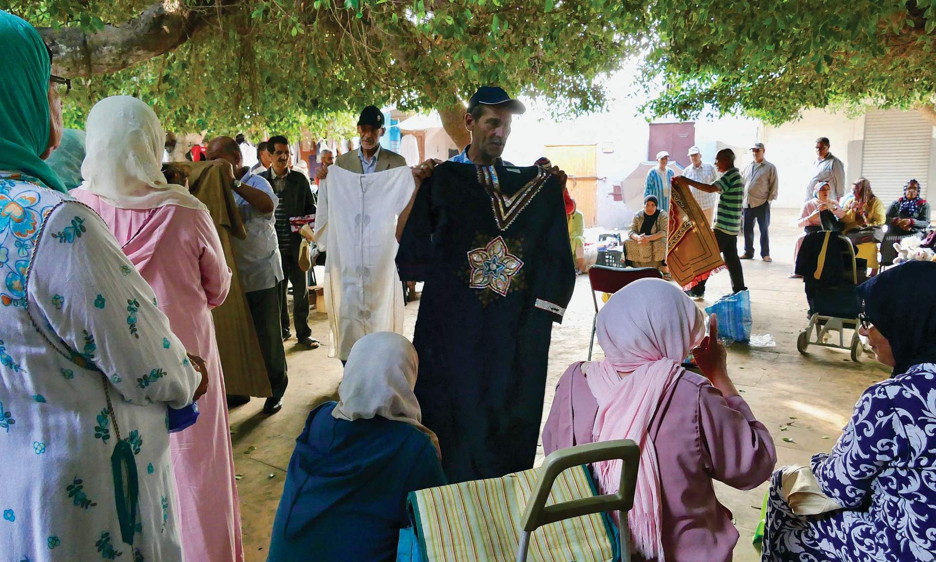 Following afternoon prayers, a crowd began to gather in the tree-shaded Souk El Ghezel, the largest square in the medina, where traditionally skeins of wool were bought and sold. But that day there was a different kind of auction, arranged by women, chiefly for women, who employ men to show off the goods – from richly embroidered kaftans to more prosaic pots and pans – and take the money.