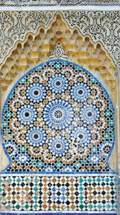 After following Jan to the Koranic school, its interior embellished with carved cedar wood, dazzling zellij tiles and ornate stucco, I slipped through the timeless souks enveloped in the aroma of freshly-baked bread, passed stalls piled high with plump olives and pyramids of aromatic spices.