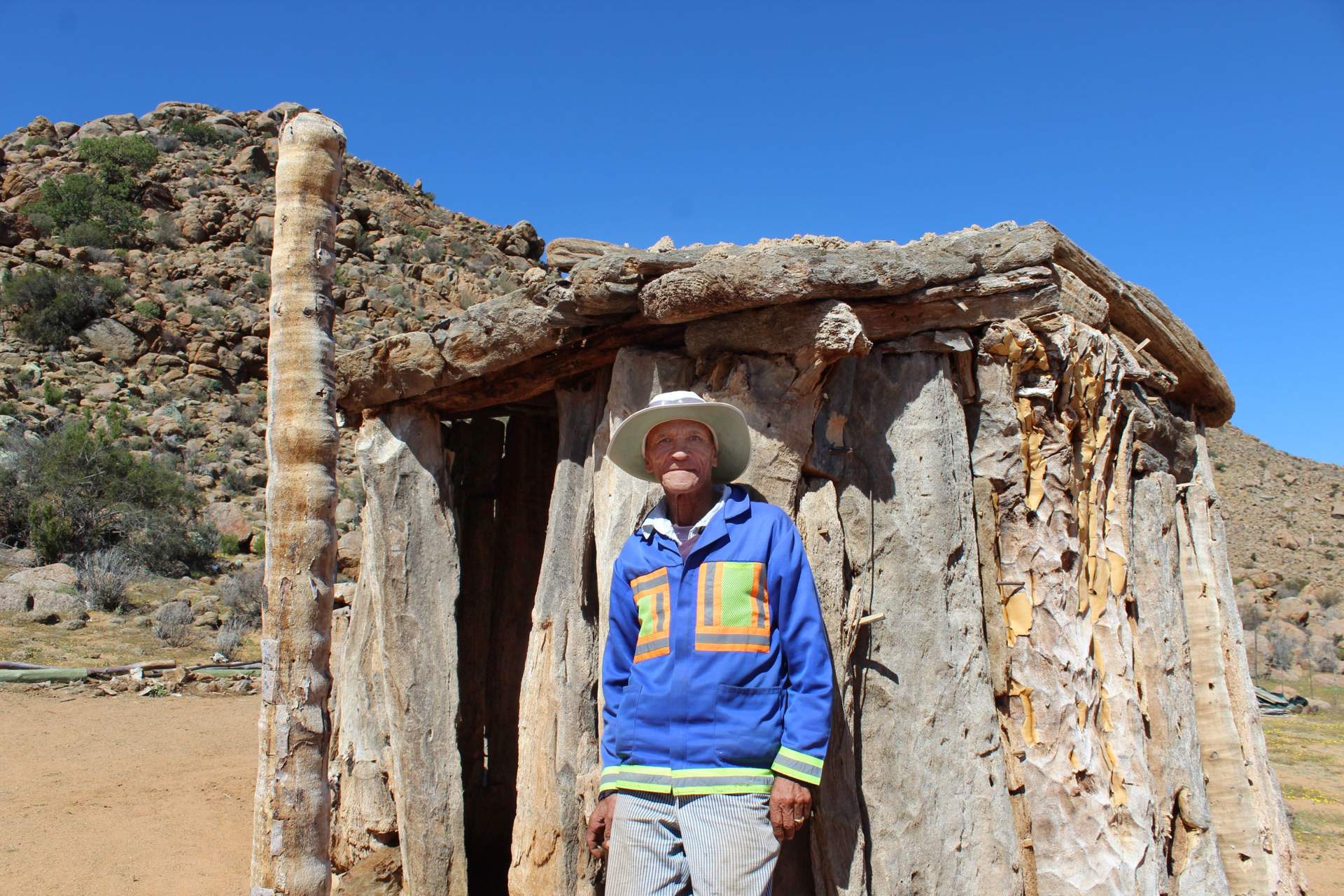 Jan, a Nama descendant stands beside his quiver tree hut near Springbok (Nora Wallaya)
