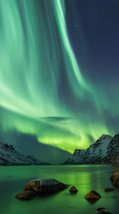 Suddenly, the full magnitude of the aurora will be apparent as it towers over the little slither of landscape you’ve included at the bottom of the frame. In daytime photography, you would probably apply the rule of thirds, positioning your horizon about a third of the way up the frame, but when it comes to shooting the Northern Lights I think that’s often too generous. Keep the sky big; the land beneath almost cowering under this stupendous light display.