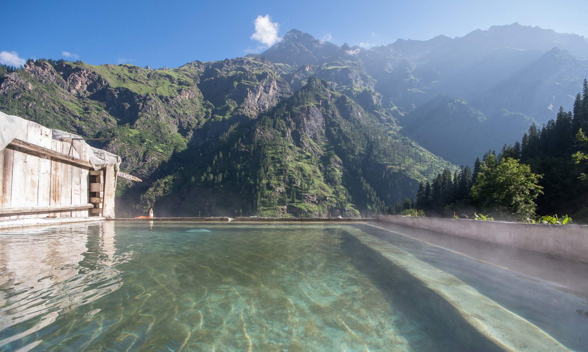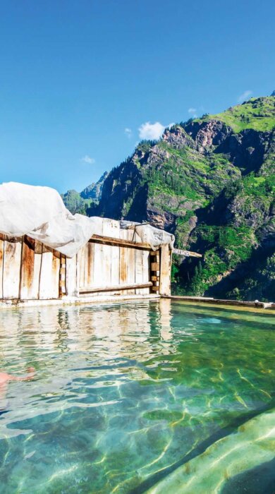 From the Parvati Valley, it takes around four hours to hike to Khir Ganga, a sacred meadow where the Hindu god Shiva was said to have meditated. Here, hot springs come with fine views of the snow-topped Himalayas.