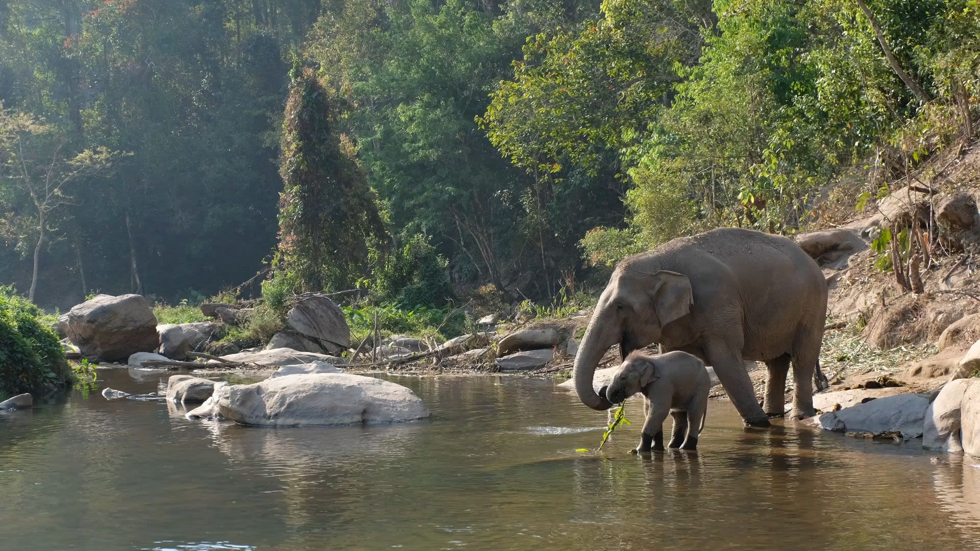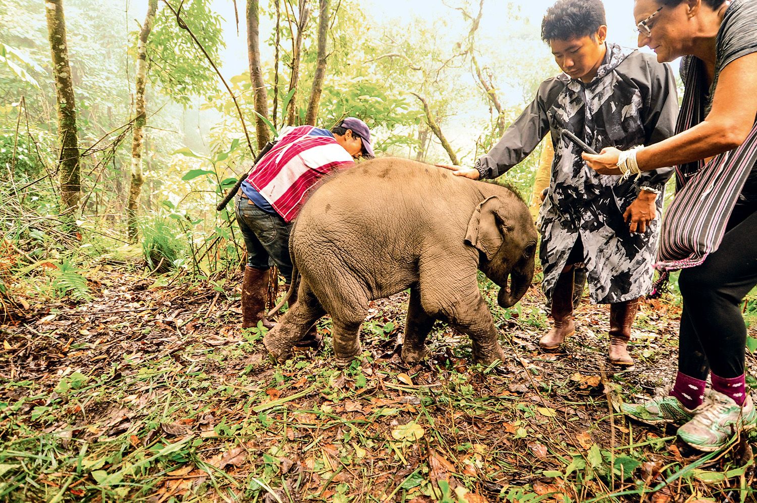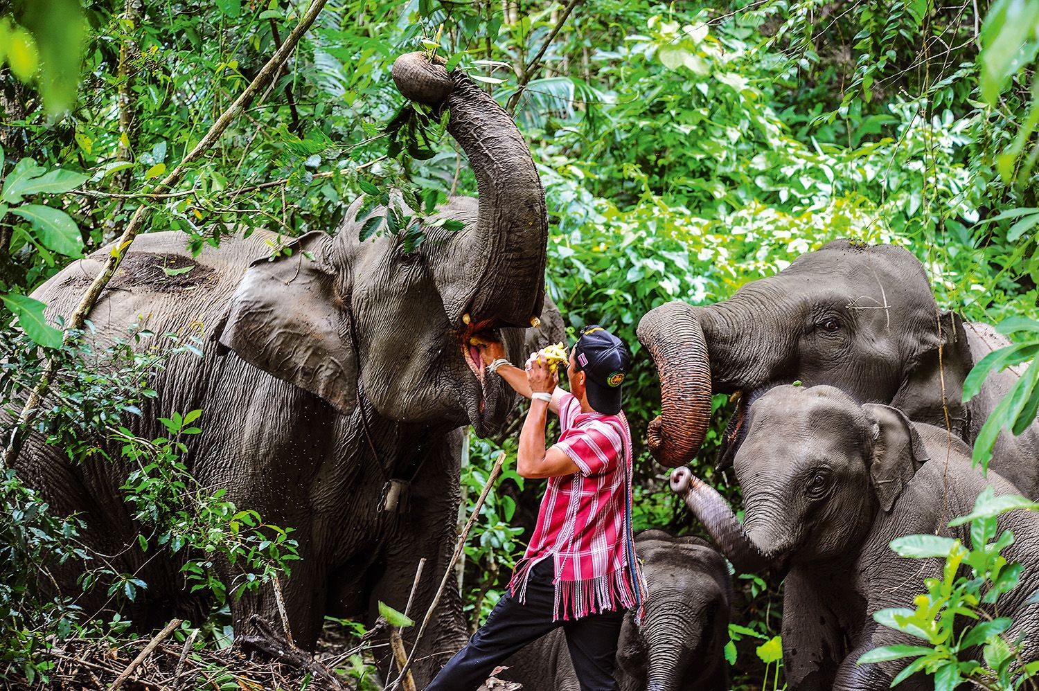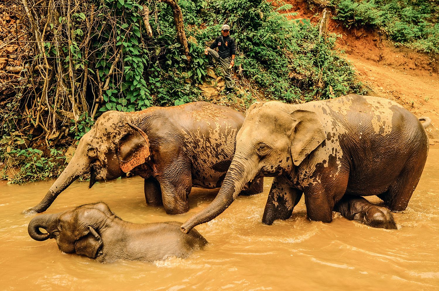 Amid tangled vines and stepping-stone crossings where the cool stream lapped my feet, I paused. The sound of snapping bamboo heralded the arrival of a herd of five Asian elephants. Their wrinkled hides were sticky with red riverbank mud and they browsed heartily, tugging up trunkfuls of greenery amid the humid jungle. Two of these animals had a particularly sad story that I’d been following online. At just a year old, baby Par-Gae-Mae lost his mother after she ingested agricultural crops that had been sprayed with pesticide; the calf was found crying beside her body. He was now being cared for by a soulmate in grief, Mo-Go-Nar, who had lost her own baby to herpes (EEHV) and had adopted him.