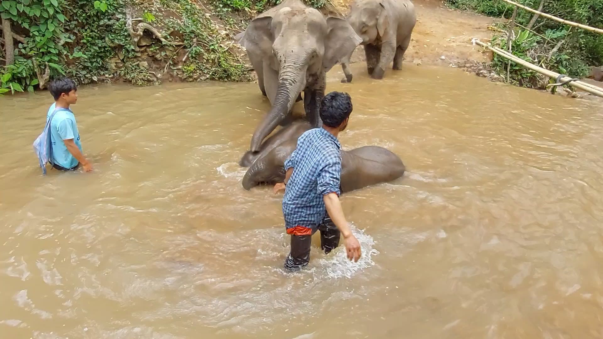 On another day a recent wild-born baby called Moe Sae got thoroughly overexcited by our presence and chased us around before slumping to the ground exhausted under Mother’s protective gaze. We were urged to avoid touching this infant as she needed to develop her wild instincts, although it was hard to avoid this bouldering little tyro. I reflected on how, if this initiative works, this five-month-old will never endure phajaan; she will exist in a semi-wild state, untrained and unchained.