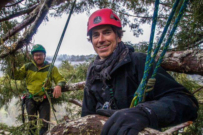 With arborist Jake Milarch, in canopy of giant redwood trees, California (BBC/Craig Hastings)