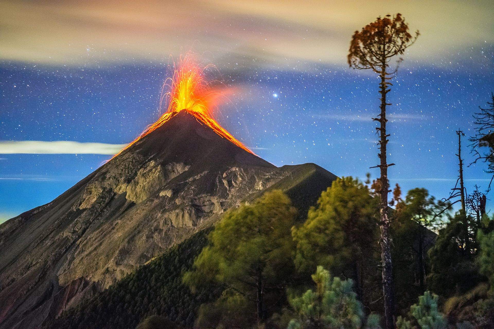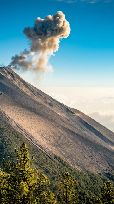 Volcán de Fuego in Guatemala is one of Central America’s most active volcanoes and definitely puts on a show. A typical eruption here features spectacular intense lava fountains and tall, voluminous ash plumes.