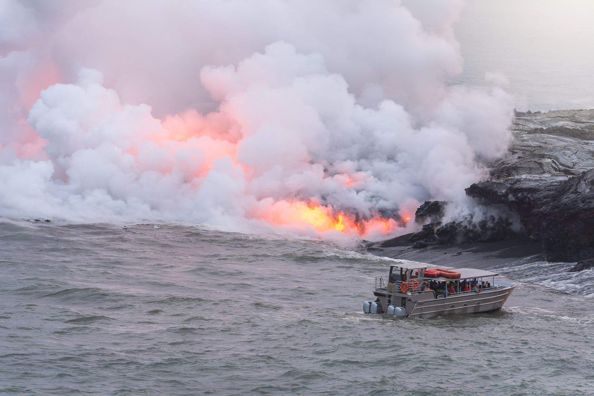 Generally speaking, though, the lava from Kilauea follows a fairly standard path down to the sea. Here tour boats gather to give visitors the unique opportunity to watch red hot lava flow into the sea, turning the waters into a steaming, boiling cauldron.