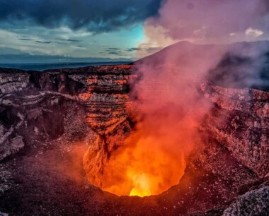 Volcán de Fuego in Guatemala is one of Central America’s most active volcanoes and definitely puts on a show. A typical eruption here features spectacular intense lava fountains and tall, voluminous ash plumes.