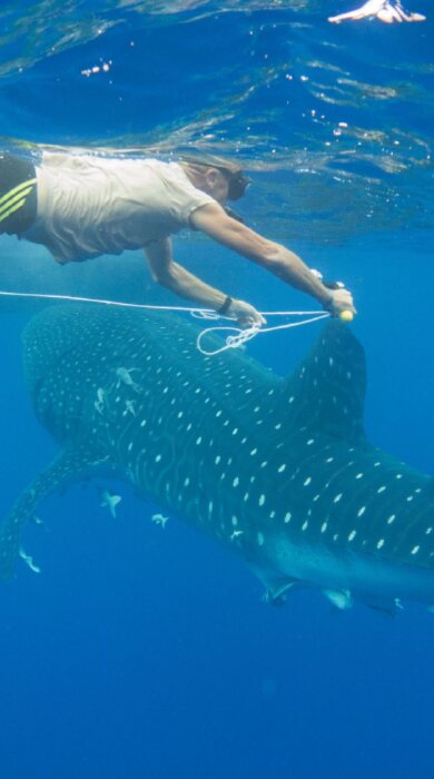 Over the summer I swim with them time and time again. Sometimes it’s with only a single shark; at other times I swim with large aggregations. I help Morgan and Mike as they measure the fish with a piece of knotted string that’s 12m long.