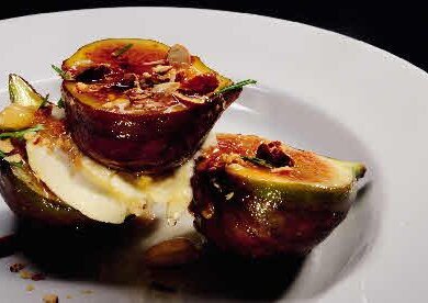 I slice the fresh goat’s cheese into 0.5cm widths, each slice big enough to cover the figs. I flatten the figs slightly and place the goat’s cheese on top and return them to the oven. Once the cheese is soft and browned on top, I place the figs side by side on plates and drizzle honey over them and serve.