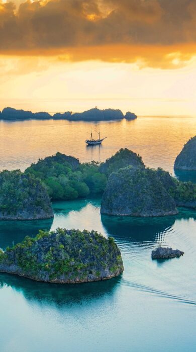 By now, we were close to New Guinea on the northern edge of the Spice Islands, today known as the Raja Ampat Regency. Volcanic cones and deep sea had given way to archipelagos of undulating limestone islands spattered with prehistoric rock artand swathed in forest. We cruised through them, stopping to swim by torchlight into honeycombs of caves and to climb rickety wooden stairways for pinnacle-top views over pearl-white beaches and shallow coral seas that faded from sapphire into aquamarine. But, for a scattering of hamlets and a few dive boats, there was barely a human in sight.
