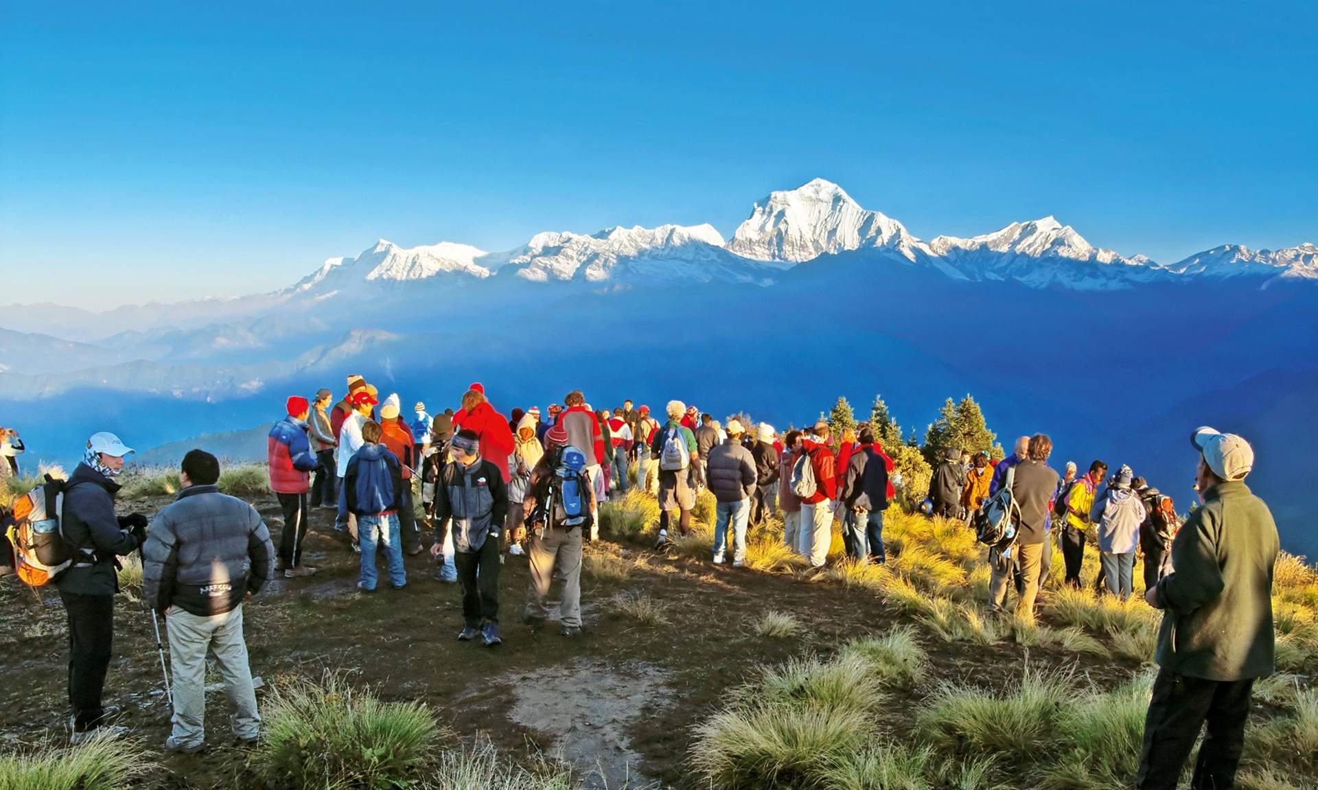 Tourists meet the sunrise at the top of Poon Hill in the Himalayas, Nepal (Dreamstime)