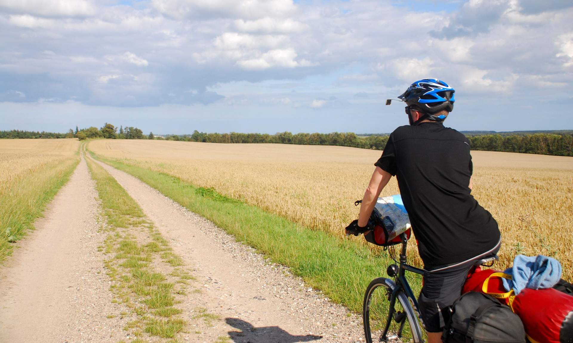 A man on a touring bike loaded up with panniers and gear on a dirt track in Denmark (Dreamstime)