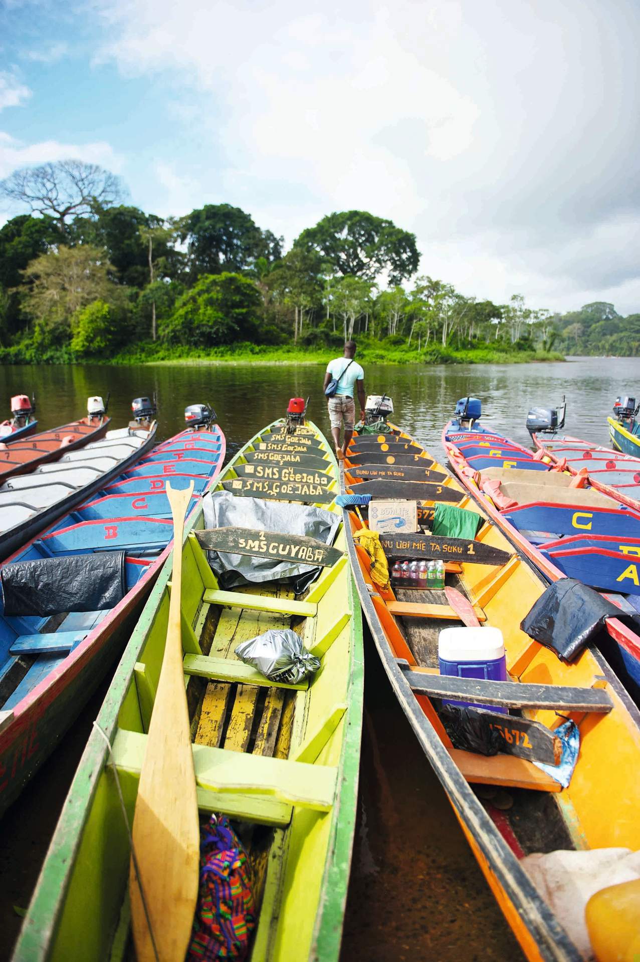 From Atjoni, it’s three hours by canoe to Danpaati River Lodge, up the Suriname River, a viscous flow with cinnamon-tinted sediment flushing from the Amazon.