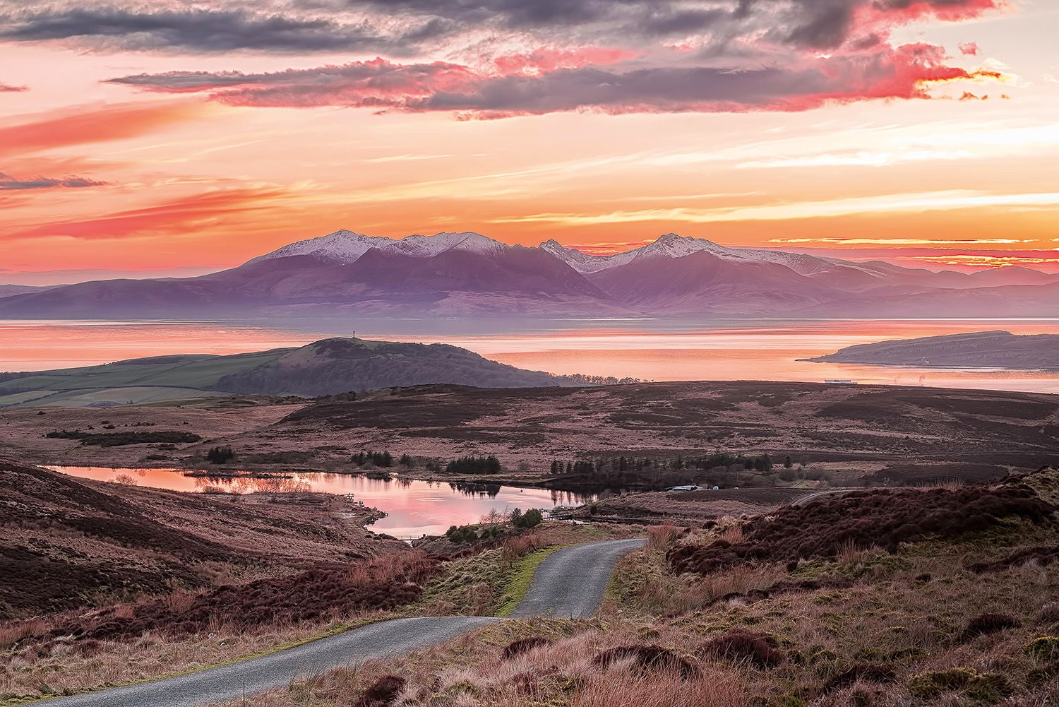 As the sun sets behind the Arran Hills, the scene reflects off the reservoir by Fairlie Moor Road (Alamy)