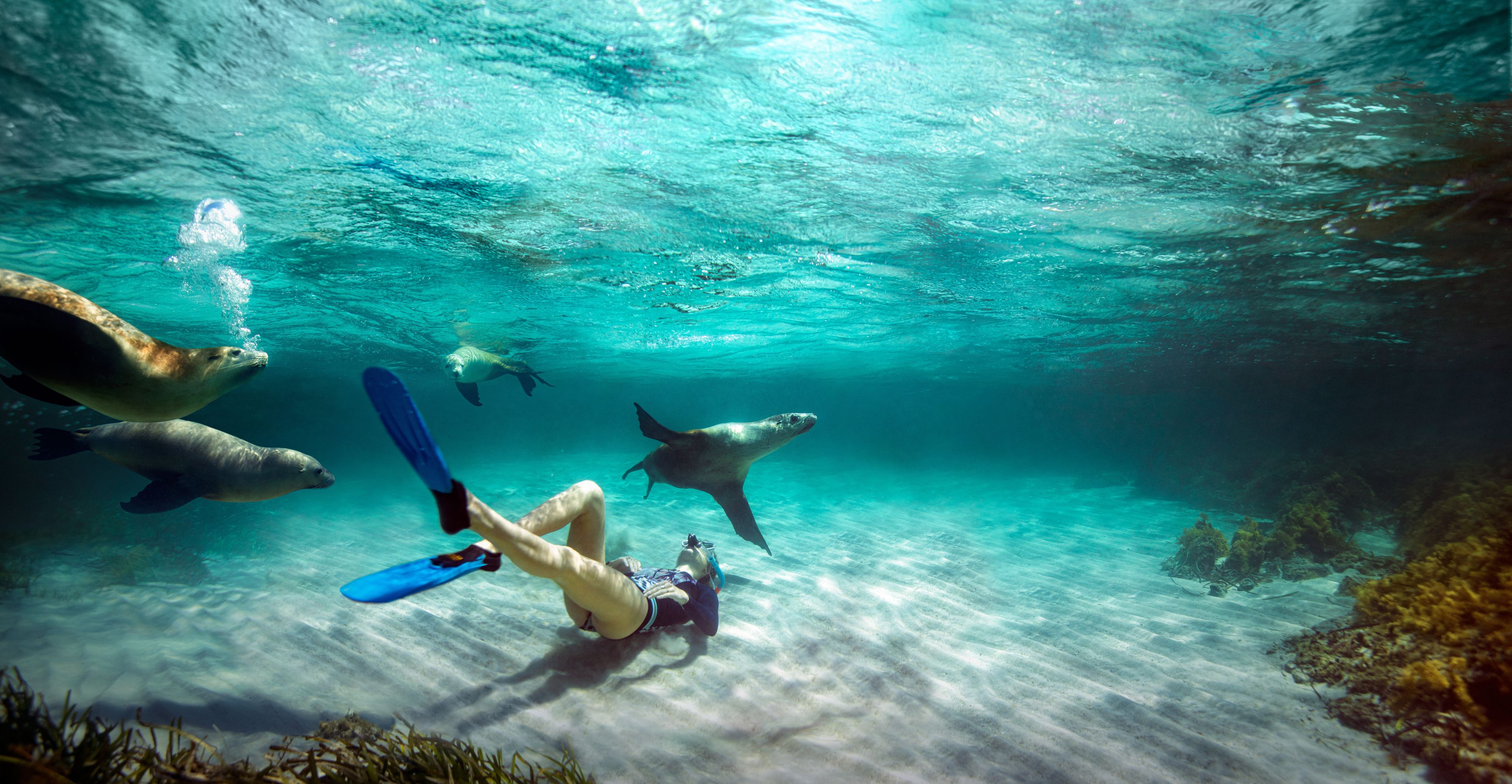 Across the border in Baird Bay, South Australia, visitors are invited to don a wetsuit, mask and snorkel to swim with resident Australian sealions and bottlenose dolphins. Watch in awe as the sealions blow bubbles around you; twirling and dancing among the seaweed as they glide seamlessly through the crystal-clear water. The dolphins often frolic at a distance as you watch underwater. One of the most biodiverse habitats in South Australia is Flinders Chase National Park on Kangaroo Island, where slow-moving echidna and playful tammar wallabies can be found under the thickets. Remember to look up to spot the elusive koala, usually found snoozing among the eucalypt tree leaves, while the long-nosed fur seals are anything but shy as they sunbathe on the granite rocks of the southwest coastline.