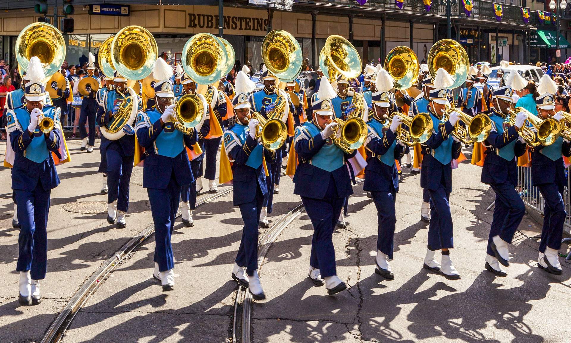A marching band parades through the streets of New Orleans during Mardi Gras (Shutterstock)
